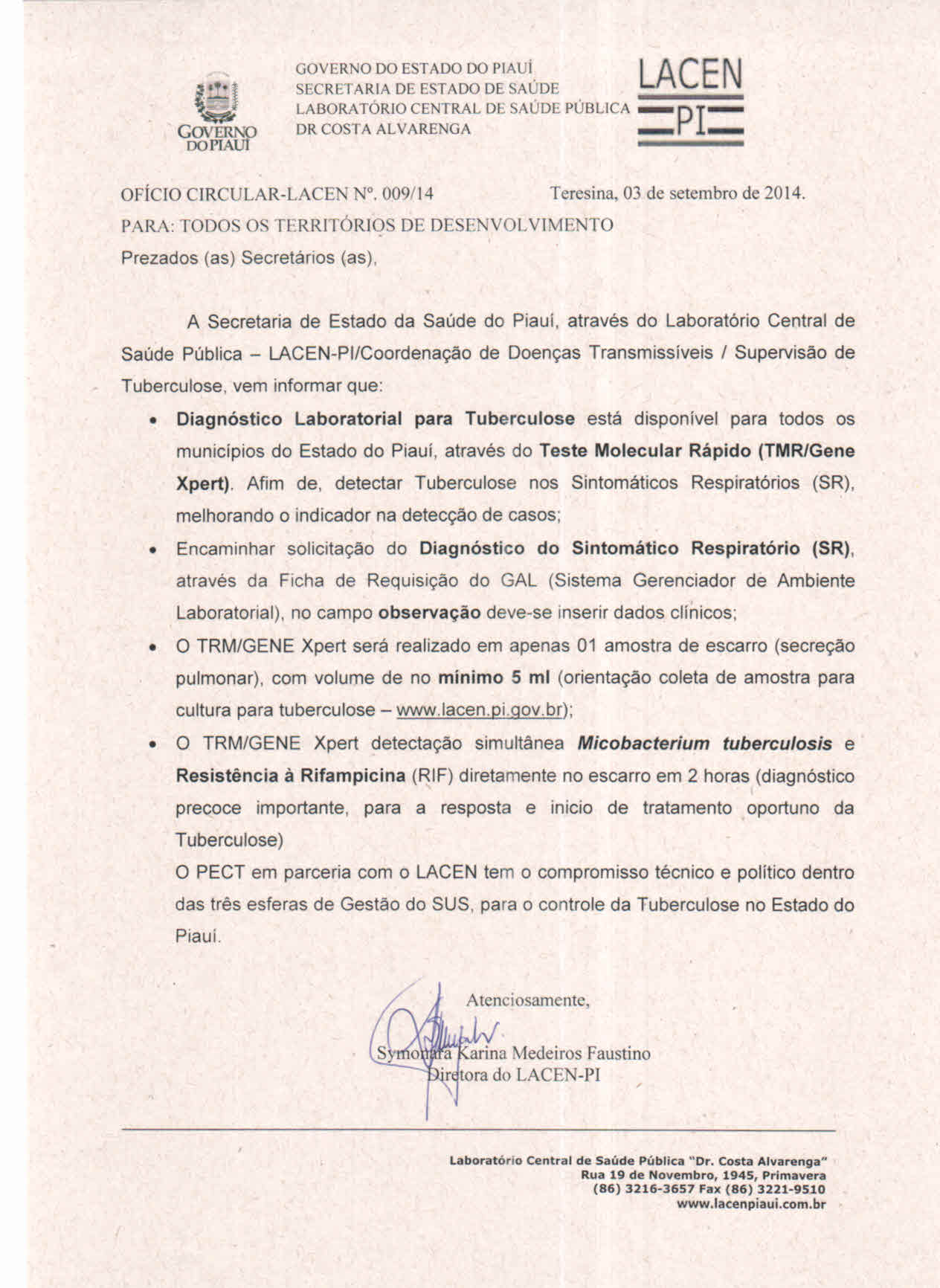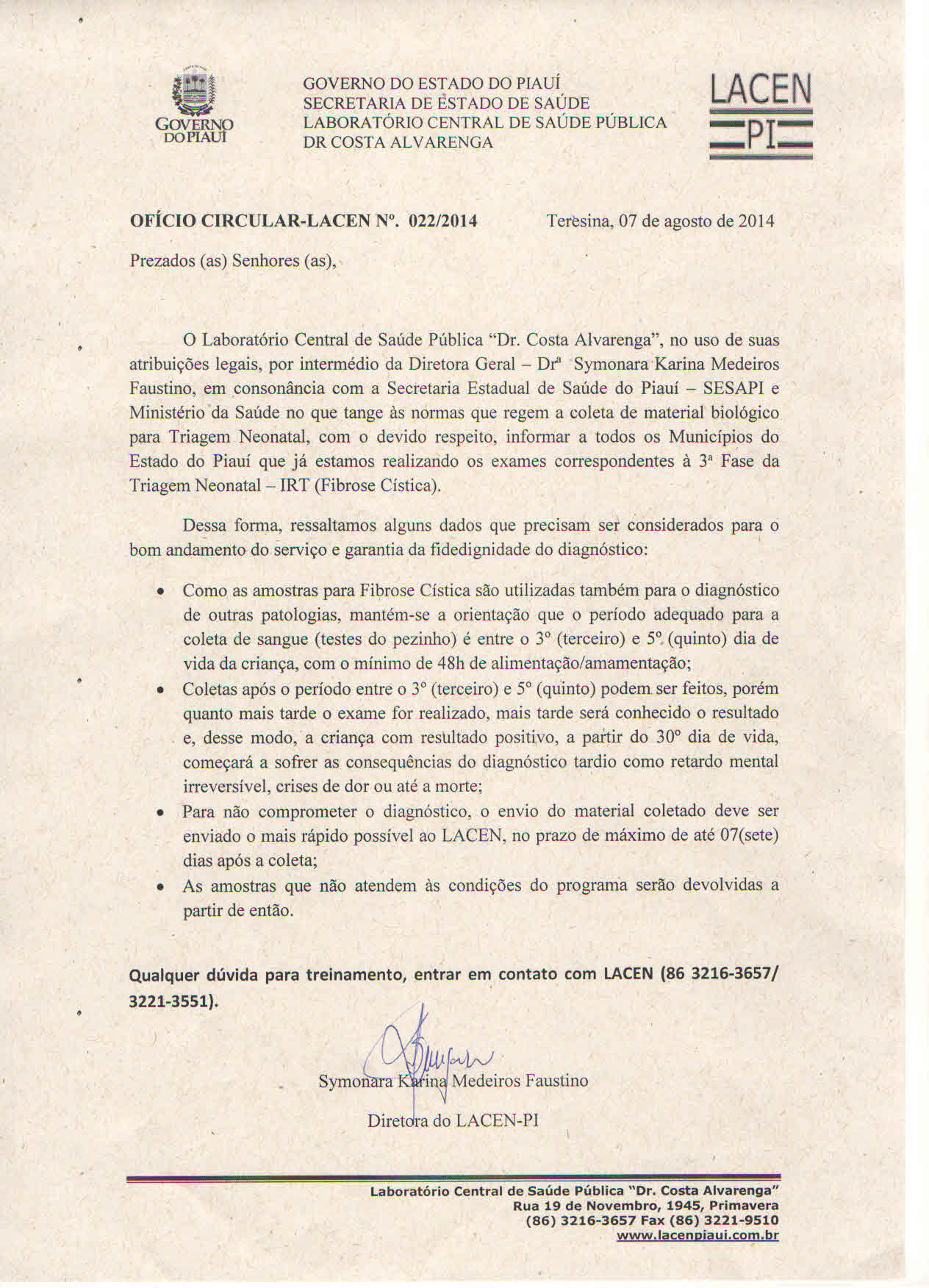 O Laboratório Central de Saúde Pública "Dr Costa Alvarenga" - Lacen-PI, por intermédio da Diretora Geral - Drª Symonara Karina em consonância com a Secretaria Estadual de Saúde do Píaui - SESAPI, vem comunicar aos Secretários Municipais de Saúde dos Municípios do Estado do Piaui, que já está realizando os exames de HEMOGLOBINOPATIAS (Sangue Total) e PRÉ-NATAL EM PAPEL DE FILTRO (HIV, Toxo IgG e IgM, CMV IgG e IgM, Rubépla IgG e IgM, Sífilis Total, HbsAg) das GESTANTES atendendo a Rede Cegonha.
